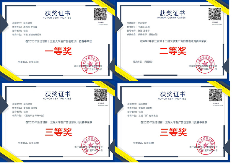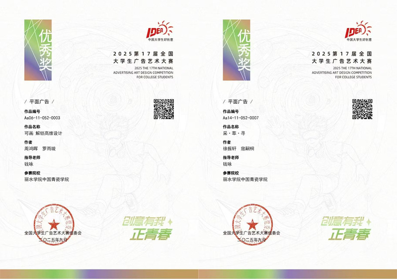 近日全国第17届大学生广告艺术大赛结果公布,丽水学院中国青瓷学院视觉传达设计专业学子凭借卓越的创意和扎实的专业功底,从全国高校无数参赛者中脱颖而出,荣获全国一等奖1项、全国优秀奖2项,省级一等奖1项、二等奖1项、三等奖4项,展现了青瓷学院学子优秀的专业能力。