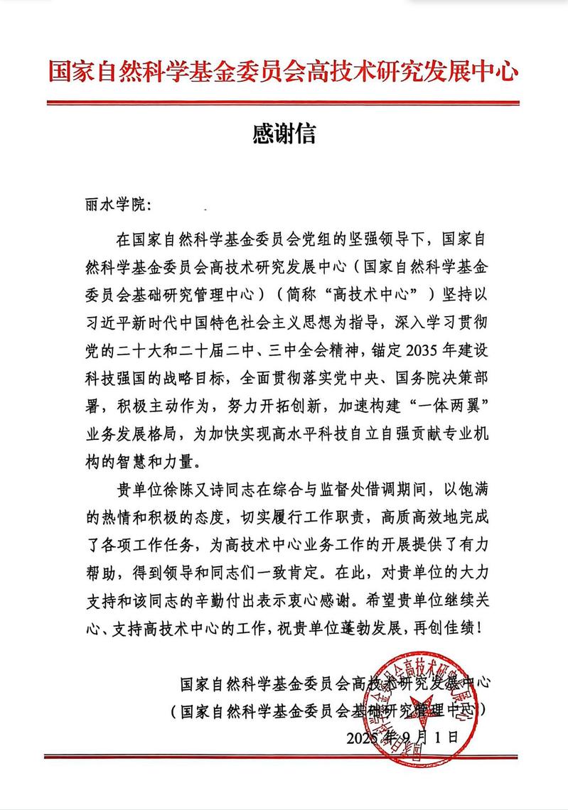 近日,我校收到国家自然科学基金委员会高技术研究发展中心发来的感谢信,对我校选送干部到该中心挂职锻炼给予的支持表示感谢。