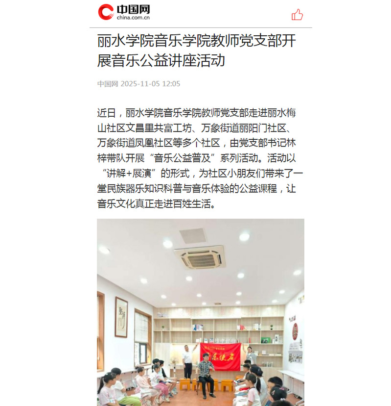 近日,中国网刊发了我校音乐学院教师党支部赴社区开展音乐公益讲座,让音乐文化走进百姓生活的文章。文中特别提到:音乐学院教师党支部依托专业优势将音乐普及与基层服务相结合,不仅让党员教师在服务群众中强化初心使命,更以接地气的方式将优质文化资源送到基层,为提升社区群众文化素养、传承弘扬中华优秀传统文化注入了高校党建力量。