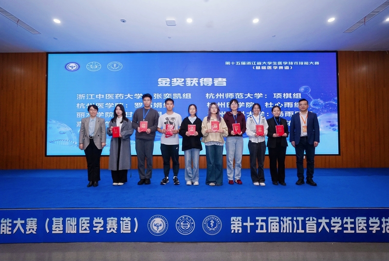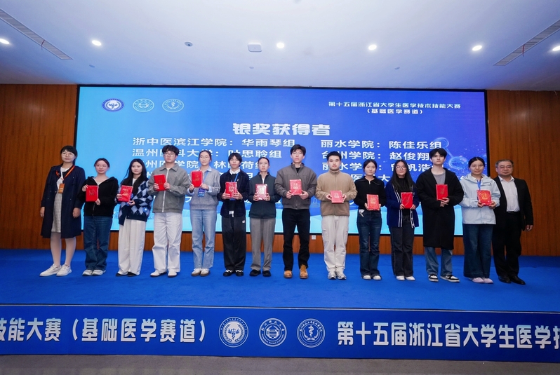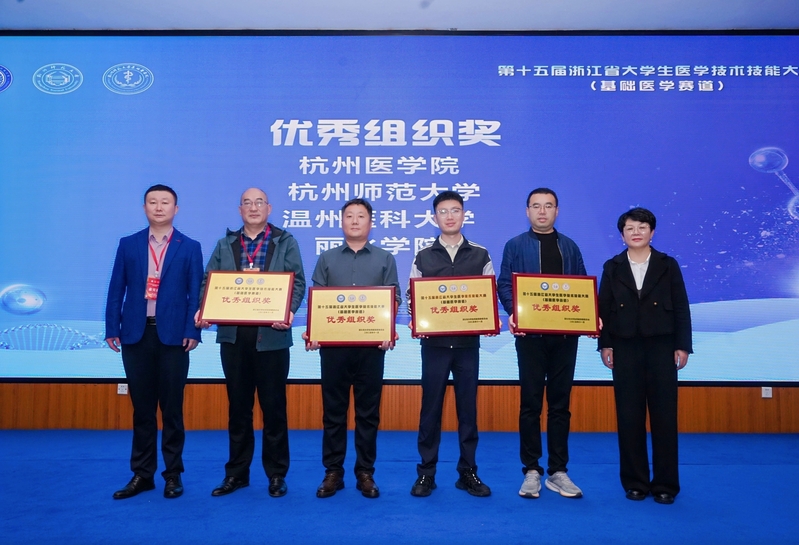 近日,第十五届浙江省大学生医学技术技能大赛(基础医学赛道)在杭州师范大学圆满落幕。来自杭州师范大学、温州医科大学、宁波大学、浙江中医药大学、杭州医学院等14所高校的39支队伍近160名选手同台竞技。我校医学院选派的3支参赛队伍在比赛中沉着应战,凭借扎实的理论基础、规范的操作技能富有创新性的实验设计以及出色的团队协作,在激烈竞争中稳定发挥,赢得了评委的认可,获金奖1项、银奖2项以及“优秀组织奖”。