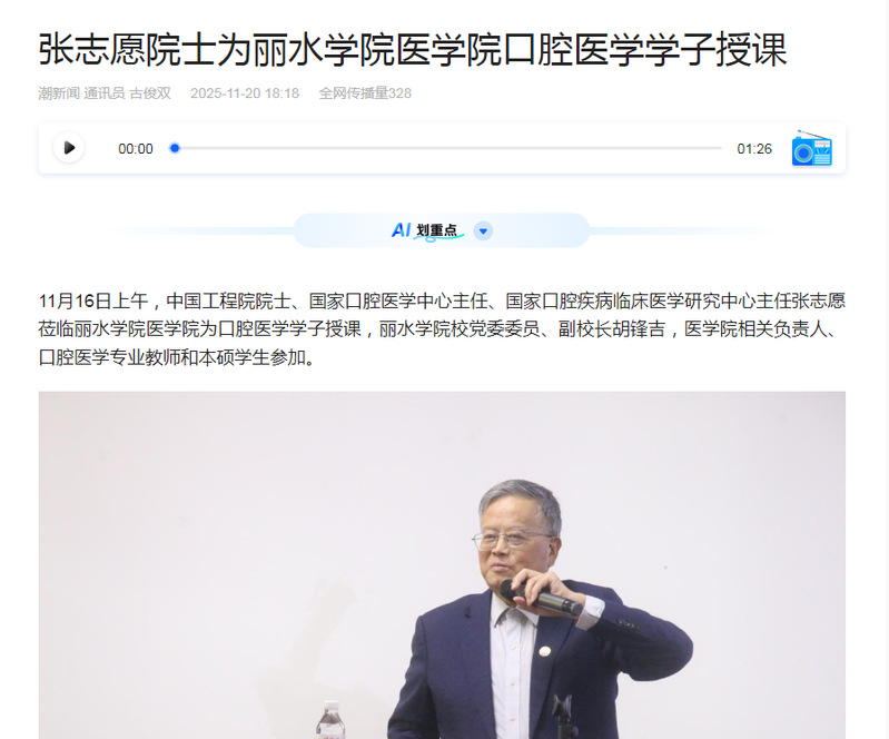 11月21日,潮新闻对张志愿院士为我校医学院口腔医学学子授课进行了报道。
