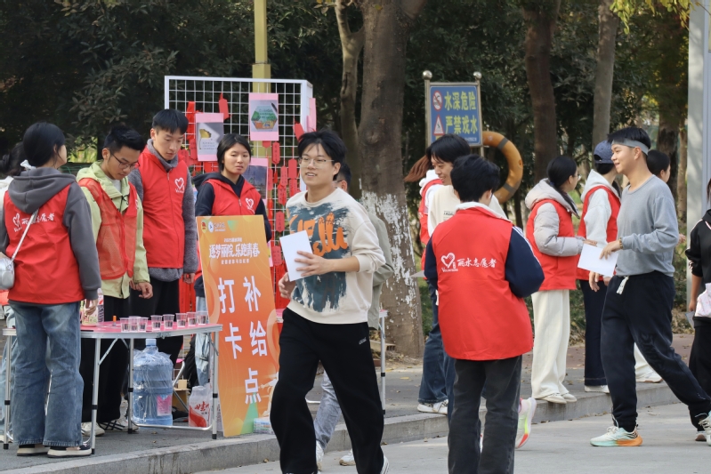 热身阶段,学校武术协会和街舞协会分别献上热情表演;身着“红马甲”的志愿者们在补给站、赛道上各司其职,递水、指引、协助打卡,用贴心服务筑牢赛事保障线;医疗志愿者全程护航,随时应对突发状况,为选手安全保驾护航。