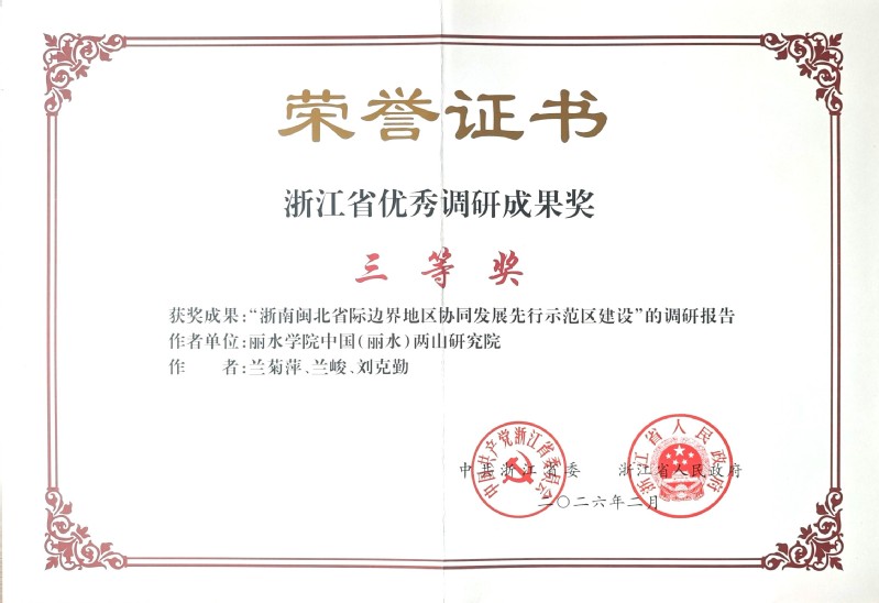 近日,浙江省优秀调研成果奖评选结果揭晓,由兰菊萍、刘克勤等完成的《“浙南闽北省际边界地区协同发展先行示范区建设”的调研报告》荣获优秀调研成果三等奖。