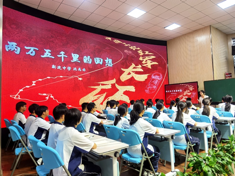 新建中学思政课教师沈禹亦以“两万五千里的回想”为主题,通过情景再现、互动问答等方式将历史与现实相结合,带领学生重温长征路上的感人故事,使学生在潜移默化中接受革命传统教育。