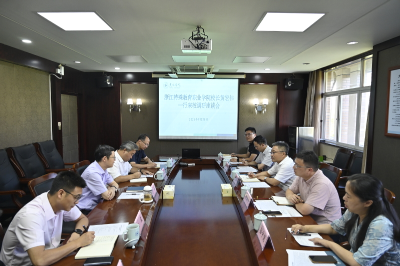 9月28日上午,浙江特殊教育职业技术学院校长黄宏伟一行来校考察交流,校长李安,副校长、党委委员胡锋吉接待了黄宏伟一行。