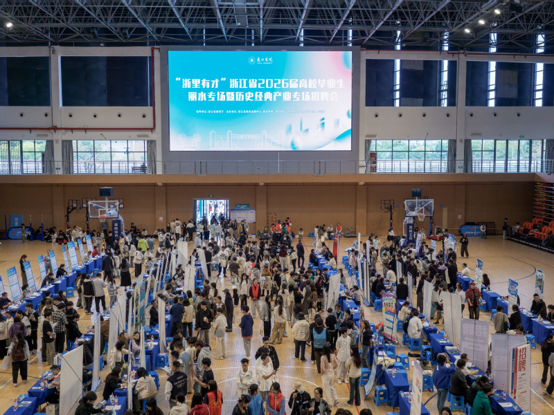 11月9日下午,“浙里有才”浙江省2026届高校毕业生丽水专场暨历史经典产业专场招聘会在我校东区体育馆顺利举行。本次招聘会共吸引了106家企业,推出各类岗位268个,需求人数913人,现场共吸引2000多名毕业生前来咨询求职。