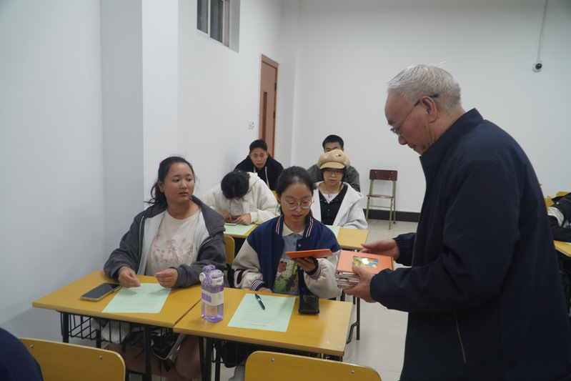 在充满仪式感的捐赠环节,丽水古树名木保护协会原秘书长吴萃森、中国(丽水)两山学院专职研究员兰菊萍共同为学生代表送上棉质手绢。一张小小手绢既是生态理念的具象载体,更寄托着对青年一代践行生态文明的殷切期许。吴萃森在现场分享时表示,“古树名木是丽水生态的活化石,手绢则是日常环保的小切口,希望同学们以手绢为媒,成为绿水青山的守护者、两山理念的传播者。”