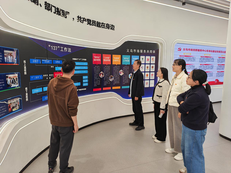 随后,党员同志们走进义乌商贸城,实地调研党群服务中心“党建统领、网格智治”工作体系,亲身感受“平面网格+垂直搭群”模式激活红色引擎、释放组织活力的强劲动能。党员们纷纷表示,将深刻领会党的二十届四中全会精神对经济建设的战略部署,把义乌商贸城的转型经验与学院发展紧密结合,一方面为优化商科课程体系、强化实践教学环节、培育复合型商业人才提供鲜活案例支撑;另一方面以产业前沿需求为导向锚定科研方向,为深化产教融合、提升服务经济发展能力注入坚实实践动能。