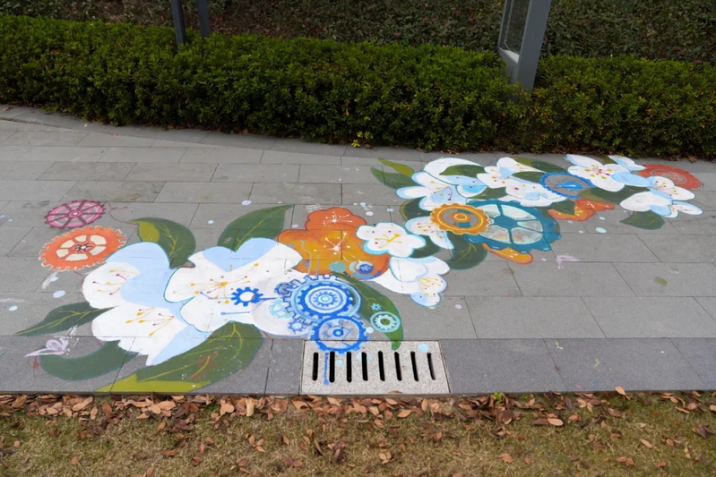 活动自10月启动以来,吸引了同学们的踊跃参与。创作者们以园区公共空间为画布,围绕“环保可持续”“科技未来”“非遗文化”等主题,完成了井盖、墙面、设施装置等多载体的创意彩绘。从宇宙爆炸的磅礴想象到芯片科技的微观呈现,从山水诗意的现代诠释到童趣盎然的科学探索,每一件作品都凝聚着创作者的巧思与热情,让冰冷的公共空间焕发出艺术的温度。最终评选出一等奖一名,二等奖两名,三等奖三名,优秀奖四名,获奖者在掌声中登台领奖,分享创作心得,现场气氛热烈。