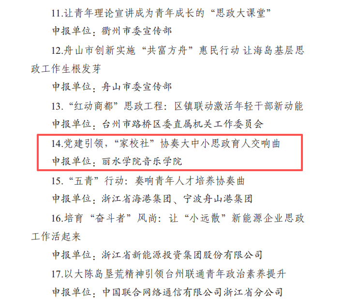 近日,浙江省思想政治工作研究会正式公布2025年度基层思想政治工作创新案例入选名单,我校音乐学院申报的“党建引领,‘家校社’协奏大中小思政育人交响曲”案例成功入围,成为全省20个获此殊荣的案例之一,这是对学校思政育人工作创新实践的肯定。