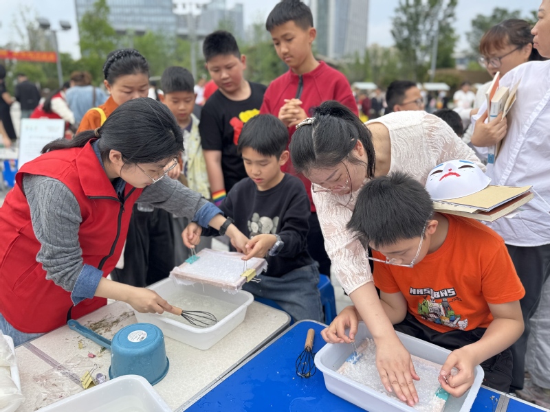 活动现场设置古法造纸工坊、活字印刷体验、“以书换蔬”驿站等多个特色体验区活动。志愿者们鼓励居民捐赠闲置正版图书,不少家长带着孩子前来,用家中闲置的绘本、科普读物等兑换新鲜蔬菜,既让尘封的书籍重新焕发价值,也让阅读与生活紧密相连。此外,志愿者们充分发挥专业优势,引导家长与孩子开展亲子共读活动,指导家长如何通过提问、互动激发孩子的阅读兴趣,在潜移默化中建设优良家风。